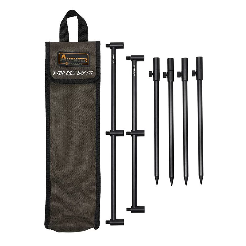 Le Avenger 3 rod buzz bar kit + carrycase est un système de support de cannes avec avec 2 buzz bar 3 cannes et 4 piques pour pouvoir pêcher à deux cannes très rapidement.