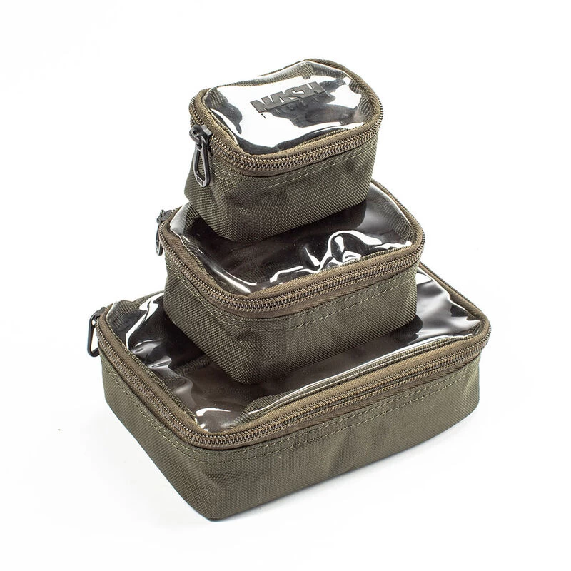Le Pouch Set de chez Nash est composé de 3 trousses à accessoires munies de dimensions différentes afin de pouvoir entreposer vos accessoires. Avec un couvercle transparent, cela offrira une visibilité rapide de leur contenu. Zip robuste Couvercle transparent 3 trousses Dimensions : Trousse 1 : 6 x 9.5 x 6 cm Trousse 2 : 6 x 11.5 x 7.5 cm Trousse 3 : 6 x 17.5 x 12 cm